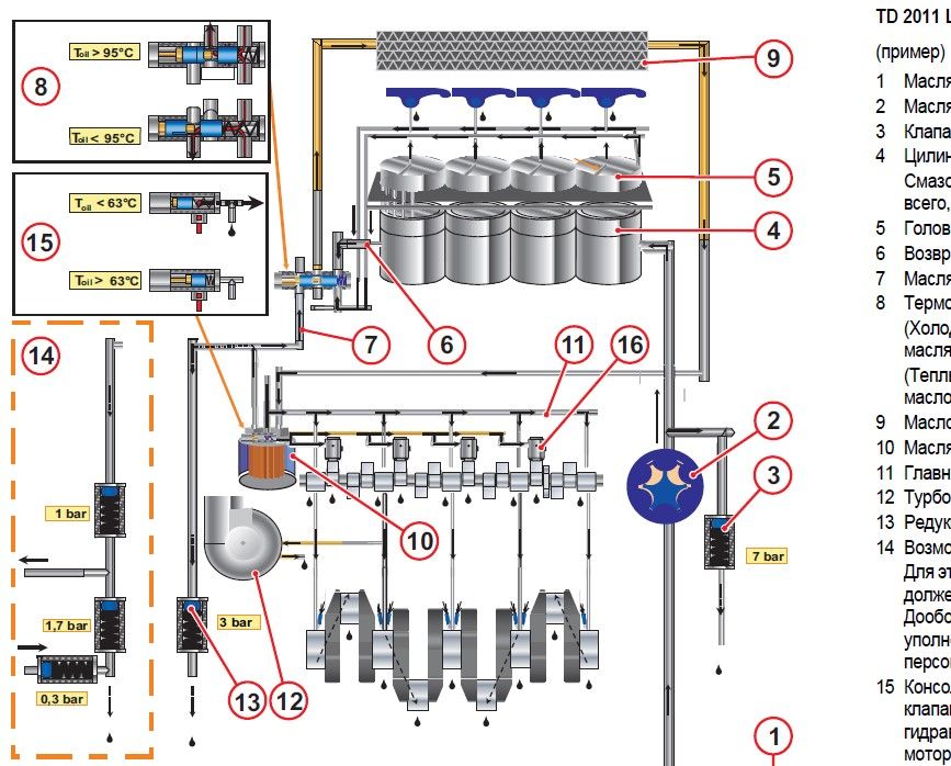 посмотрел картинку дейтца. системы смазки получает масло после системы охлаждения. Соответственно вся система охлаждения работает под высоким давлением 3 бара. И одновременно с большим расходом. Лишнее масло после сливается. Своеобразное решение. Маслонасос нужен- зверюга...