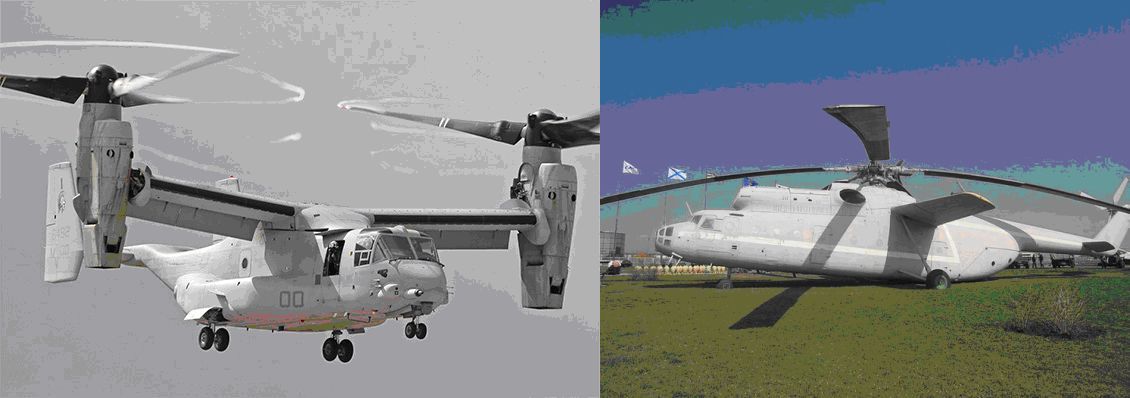 Посмотрите на фотографии ниже где видна крутка лопастей конвертоплана и вертолета Ми-6, а так же на изящное решение проблемы взлетать  и садиться вертикально и летать быстро.