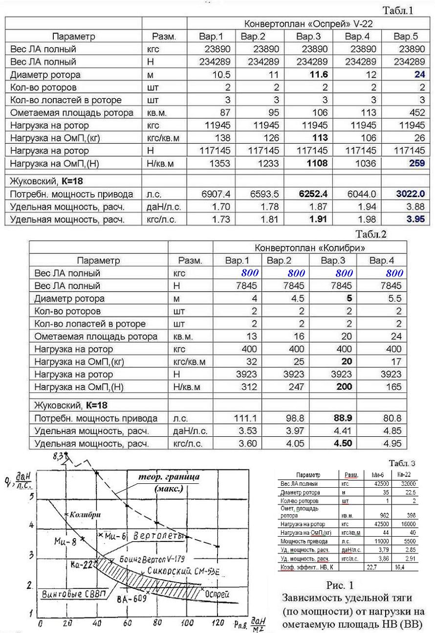 Дальнейшие «рекомендации» г-на @Anatoliy. в части конвертоплана «Колибри» носят совершенно непонятный характер. Рекомендуя увеличить мощность двигателя до 200 л.с., г-н @Anatoliy. провозглашает неприменимость номограммы и формулы Жуковского-Вельнера при проектировании легких вертолетов и конвертопланов. Он предлагает уменьшить удельную тягу несущих винтов конвертоплана «Колибри», имеющего нагрузку на ометаемую площадь всего 20 кг/кв.м (табл.2 вложения)., до уровня конвертоплана «Оспрей» с qN = 1,91 кгс/л.с. вместо достижения удельной тяги qN = 4,5 кгс/л.с, что достижимо при рядовых профилях лопасти.