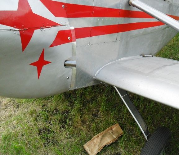 Напали на муху злые кони. Подъехал тут на днях к мухе  и очень  расстроился. П.В.Д. отломан, чехол на левом крыле задран, ну думаю вандалы. 🙁  Стал осматривать.  Сразу понял, что за "вандалы", накопытили они вокруг, мама не горюй, кони одним словом.Кроме ПВД пострадала законцовка левого крыла. Обшивка на ней пошла волнами,видимо долбанули в дужку.  И что им там надо было?.Возможно просто подошли, а пастух шуганул, вот они и ломанулись. Но пастух как партизан : не видел, не знаю. Хрен с ним ,думаю да и вообще легко отделался, могли бы и по крылу или стабилизатору пробежать. Два дня работы. Один день строил загородку, второй, ремонт. Из поршня от ГАЗ-51 сделал утюжок. Если налить керосина до масло съемных дырочек,то после его выгорания температура днища получается 170* т.е. самое то. Прогладил и законцовка как новенькая. Термо усаживающаяся тряпочка, вещь. С ПВДшкой повозился подольше. Вот такие дела.