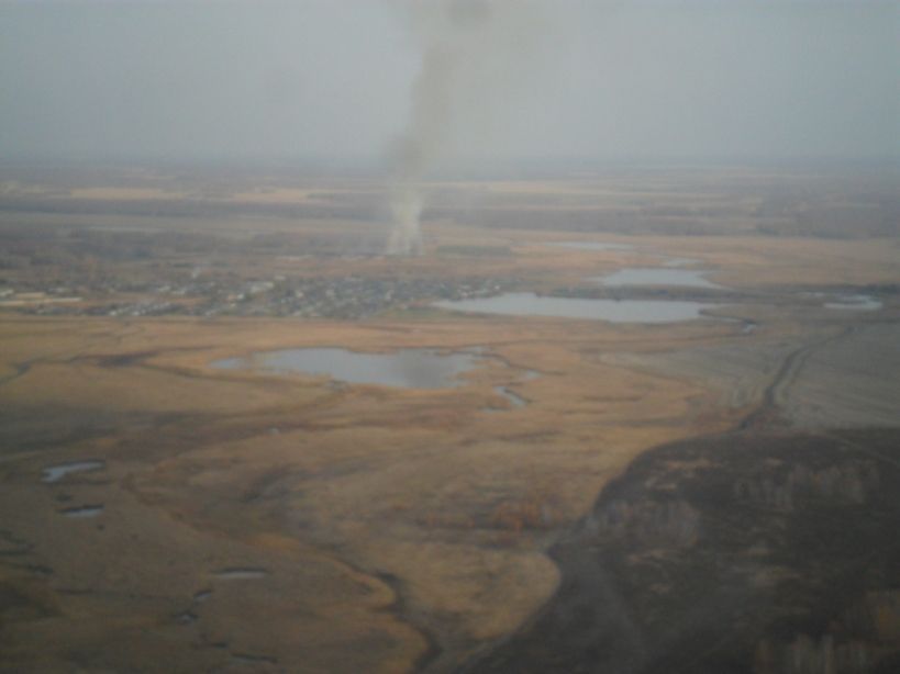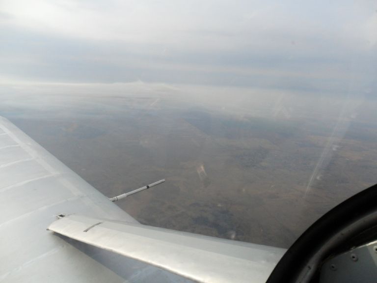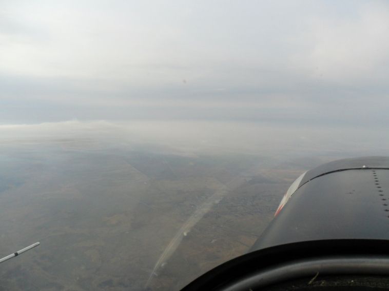 Последние погожие деньки. С понедельника обещают дожди. Решил закрыть сезон. Заправился и взлетел. Полный штиль, температура 12*. На полях жгут солому и в воздухе стоит плотный смог. Попробовал подняться над смогом. Легко набрал 1250 м, выше лезть не стал.  Самолет высоту набирает легко  РУД 75%. Интересно какой практический потолок?  На высоте 1000 м земля почти  скрылась в дымке. Пока поднимался, пока спускался, ушел километров на 60 от точки. Снизился в совершенно не знакомом месте и минут 10 летел в полном не ведении ориентируясь только по компасу.