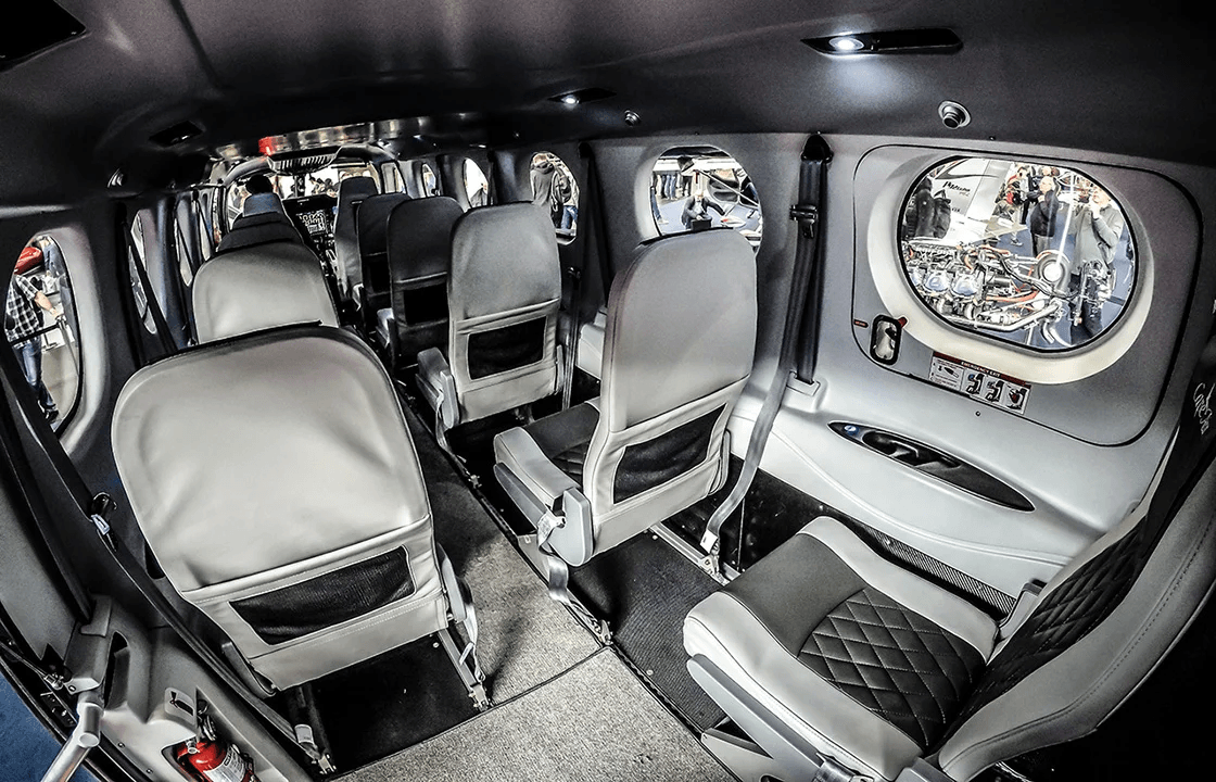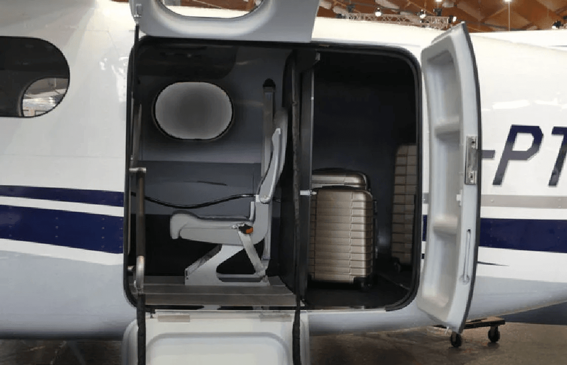 Салон самолета рассчитан на перевозку 9 пассажиров. Которые летят в комфортных кожаных креслах.