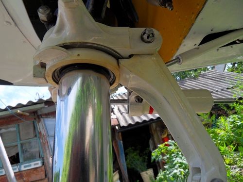 в нижнюю часть цилиндра и тогда действительно педалями её не своротишь пока она не обожмётся и эта механизма не выйдет из-зацепления.Это в принципе и сделано что бы в полёте колесо было сориентировано,ведь не даром в поводках на стойке имеются свободные хода порядка 50мм.