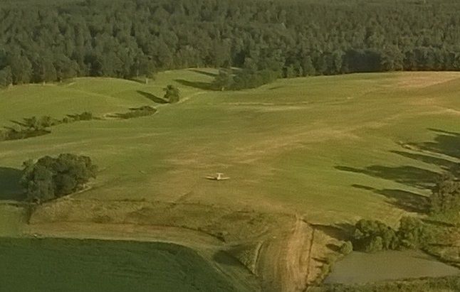 Приехав домой и по-быстрому перекусив мы запрыгнули в машину и поехали в наш аэропорт. Сделав предполетный мы завелись, прогрелись и решили никуда не лететь, а просто полетать часок по кругу. На кругу мы начали одни, а потом подтянулось еще несколько самолетов и даже стало немного тесновато. Всем приходилось быть внимательными и держать дистанцию и тут какой-то "орел" заявляет посадку с ходу с дистанции в 5 миль с полной остановкой. Два самолета впереди нас вынуждены были продлить полет к 3-му, чтобы не пересечься с ним на 4-м. Круг растянулся и была очередь лететь моего КВСа. Когда мы сделали наш 4-й, то времени у меня поглазеть по сторонам было предостаточно. И тут я увидел внизу на поле самолет, достаточно большой и с виду вроде целенький. Я сразу вспомнил разговоры на планерном аэродроме про недолет. Телефон был в кармане и я смог его снять только на следующем заходе к 4-му. Подробностей пока не знаю.