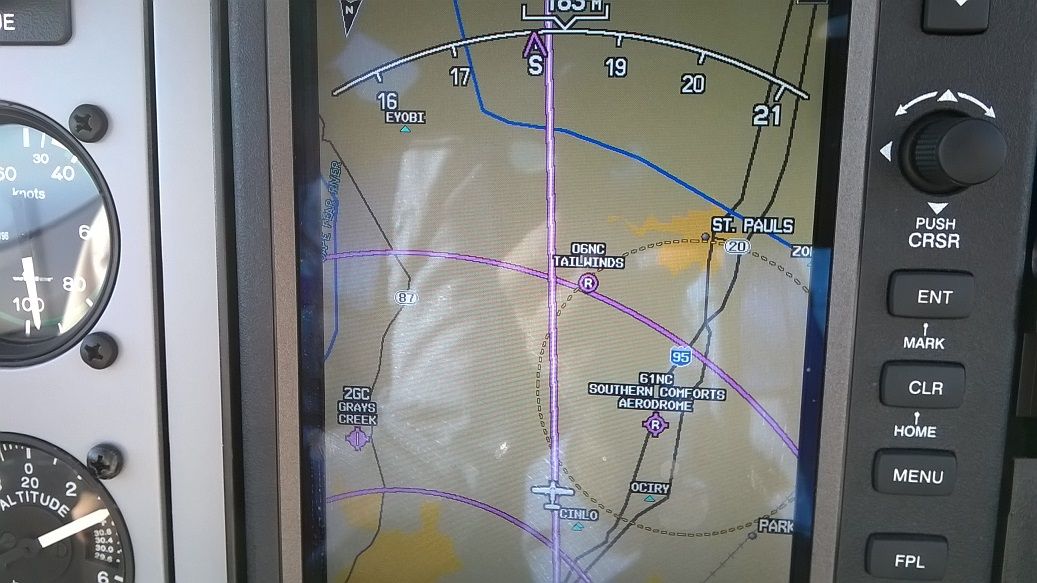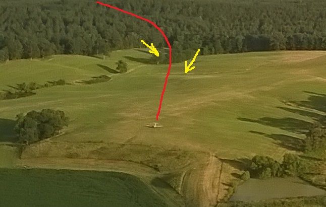 Мотор у него отказал в 4-х милях к югу от этого места (в сторону его правого крыла), т.е. он садился на это поле правым кругом. Он летел в этот аэропорт и в 4-х милях от аэропорта высоты у него уже было немного. Красным я нарисовал, как он садился. Желтыми стрелками обозначил деревья и ограду на поле, через которые он "перепрыгивал". Запасу впереди у него осталось не много. Молодец, одним словом, не растерялся.
