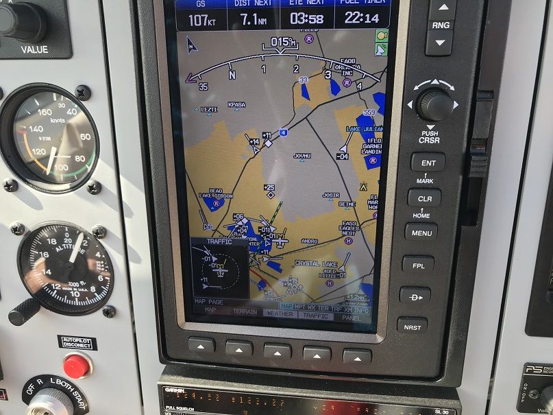Но моя супруга рвалась в бой и мы взлетели. Через пять минут диспетчеры объявили, что они открыли вылет, а прибывающих загоняют в зону ожидания над озером. Я начал психовать, типа я же говорил, и жена предложила вернуться. Но я уже закусил удила и, поставив 100 узлов на высоте1200 полетел к озеру. Вот как это выглядело на GPSе. Самолетик это мы.