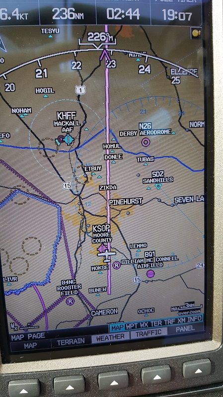 Теперь нам надо облететь запретку и зону военных (слева). Наши соседи, самая большая в США военная база – Форт Брагг. Вон те рыжие пятна это то место, где взрослые дяденьки играют в войнушку, причем очень классными игрушками. [ch61514] Впереди слева еще и военновоздушная база. Но мы уже запросили сопровождение у диспетчеров и они нас проведут как надо.