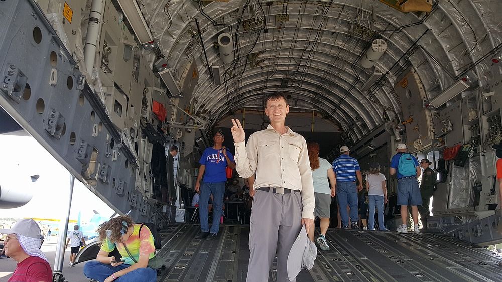 Я люблю сидеть в кабинах интересных самолетов. На данный момент в моей коллекции V-22 Osprey (боевой), я даже на его боевом тренажере "летал", С-130 (боевой), SR-71 (музей), Фантом F4 (музей), возможно что-то еще, сразу не вспомню, а теперь вот еще и С-17.