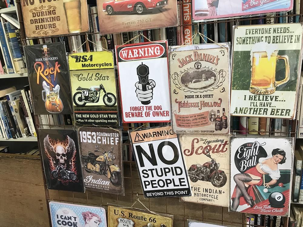 Потом гуляем по улице и заходим в старый книжный магазин. Там очень интересный стенд с прикольными знаками.