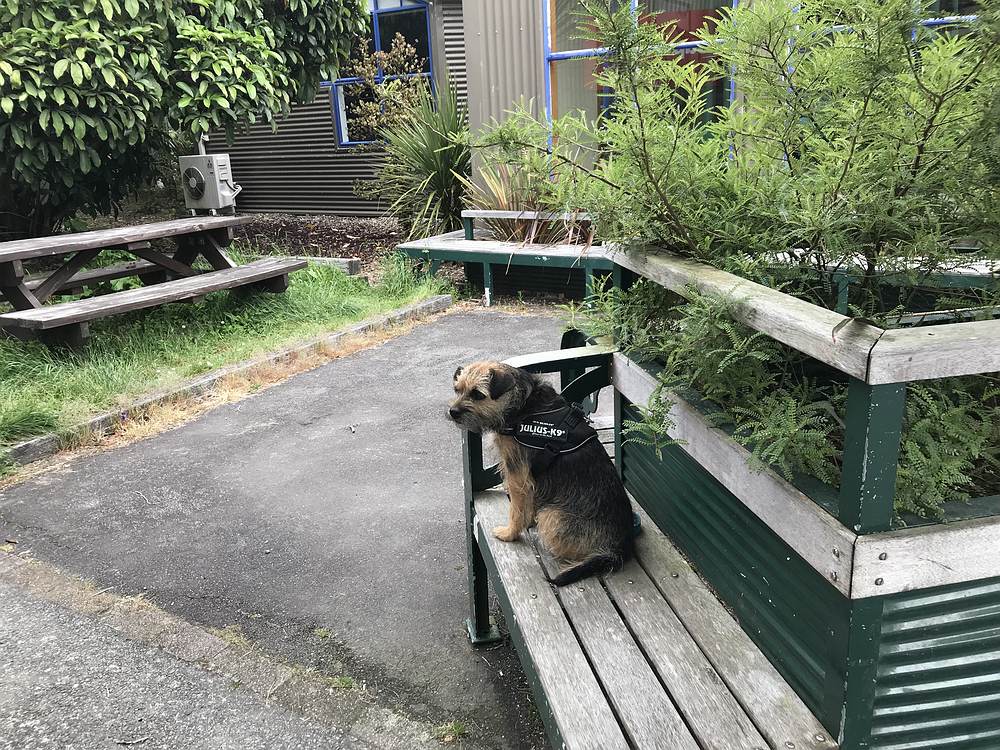 Собака косит под полицейсую. На жилетке написано Джулиус из команды К9. К9 - это полицейское отделение служебных собак.