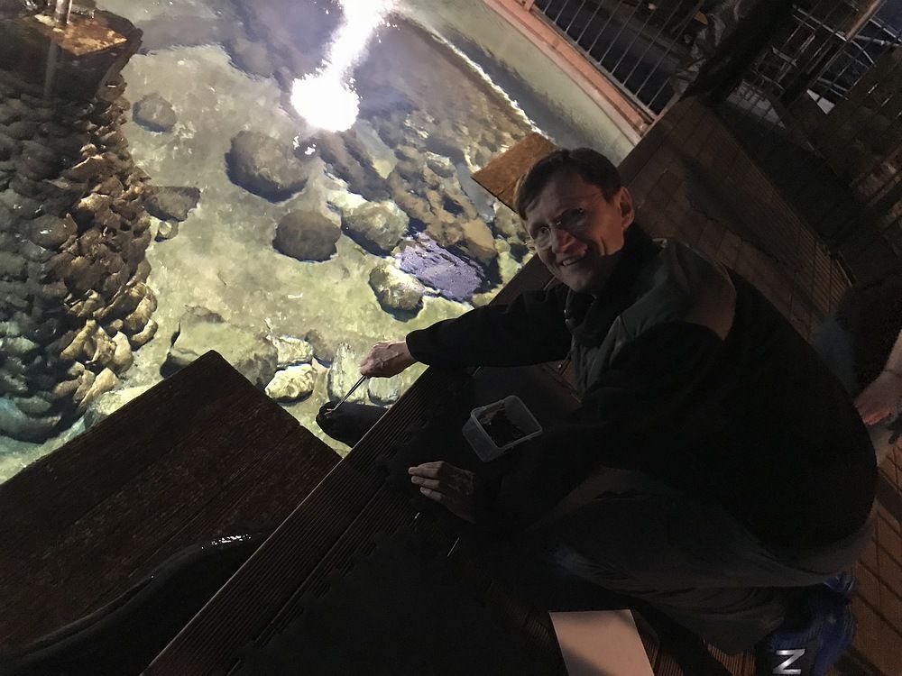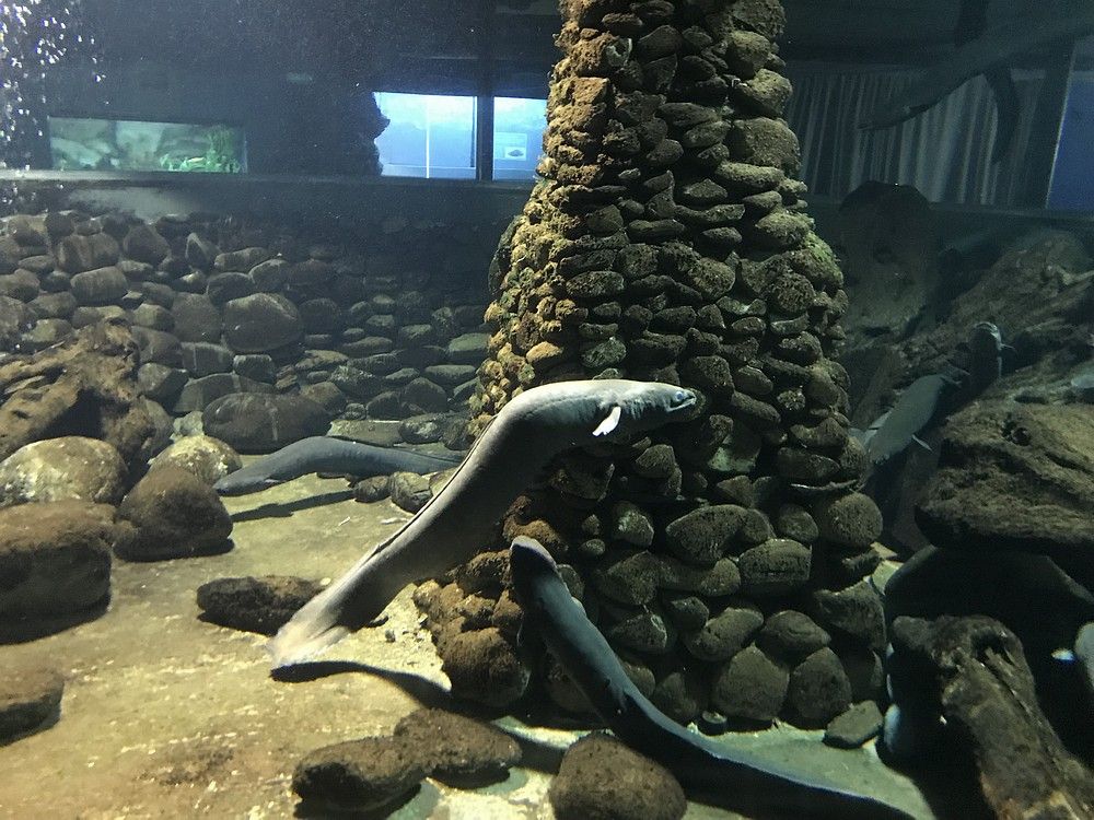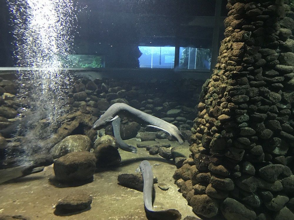 Тут мы удачно попадаем ко времени кормления местных пресноводных угрей (тоже ровесники мамонтов) и даже в нем участвуем.