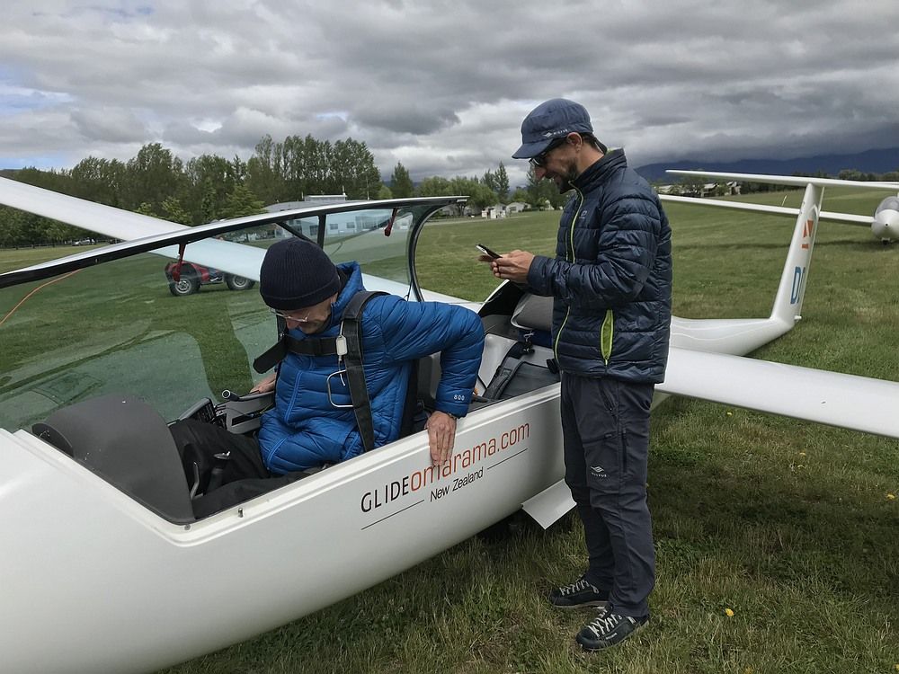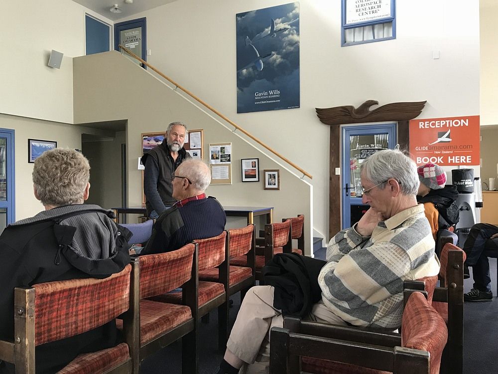 Подходит еще одна пара на предмет прокатиться на планере. Они из Англии и он уже тут в Зеландии прыгнул с парашютом, прокатился на дельтаплане, на вертолете и теперь вот хочет попробовать планер. Нас всех приглашают в соседний зал на брифинг.