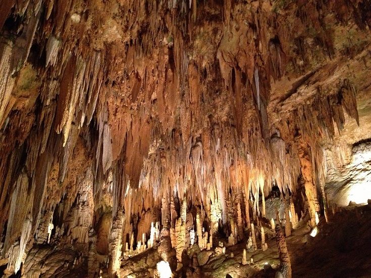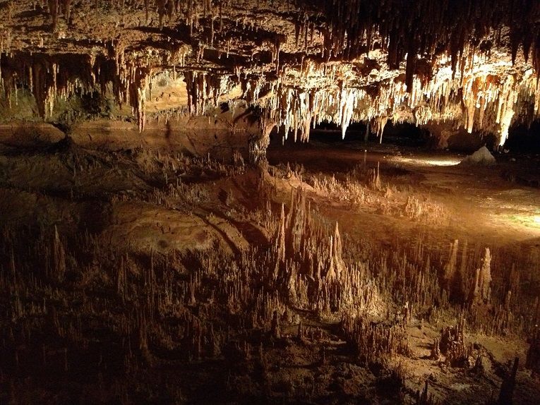 Вылетели утром около 8:45 и, набрав высоту, запросили сопровождение у соседнего международного аэропорта Рали. Накануне ответственный за путешествия товарищ позвонил их диспетчерам и предупредил о массовом вылете, но, не смотря на это, они с большим интересом распрашивали чего это мы и куда это мы. Погода была, как по заказу - солнце и ни каких движений в воздухе. Летели всю дорогу как в молоке и даже у гор все было спокойно. Диспетчеры передавали нас из зоны в зону до самого Вашингтона, до запретки которого от конечного пункта было всего 9 миль. "Пещерный" аэропорт находился в долине между двух хребтов и в связи с этим имел некоторые особенности захода, но ничего из ряда вон, просто, в зависимости от ветра, круг был левым или правым. После посадки последнего самолета нас загрузили в несколько легковушек, предоставленных волонтерами, и в несколько приемов закинули в городок к ресторанчику. После обеда таким же образом нас доставили к пещерам. Мы уже видели много пещер в разных штатах и удивить нас трудно, но эти пещеры нам понравились.