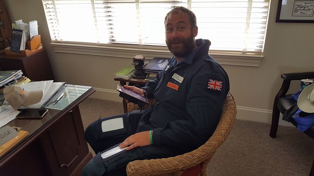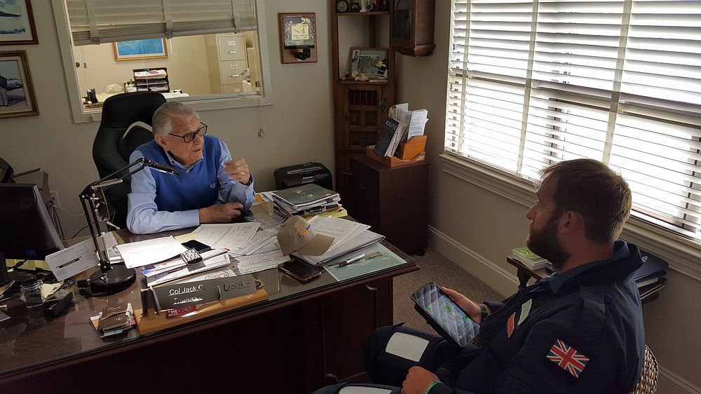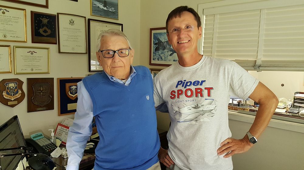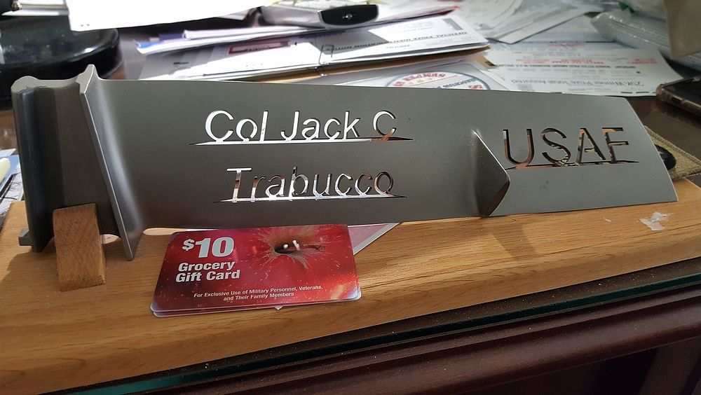 Надо было готовиться к встрече и я спросил у парнишки а нельзя ли будет заправить его со скидкой, бензин тут был дорогой. Парнишка скрылся за дверью за стойкой и стал кому-то рассказывать о моей просьбе. Оттуда вышел дедок, который оказался менеджером этой авиасервисной компании, и я подробно все ему рассказал. Завязался разговор, в ходе которого выяснилось, что он полковник ВВС в отставке, всю жизнь в авиации, летал на Сейберах и Фантомах и у него 267 боевых вылетов во Вьетнаме. Он провел меня за стойку к себе в кабинет, где мы продолжили нашу беседу. Все стены кабинета были увешаны регалиями, дипломами и грамотами. На столе стояла странная табличка с его именем, только дома, сортируя фотки, я понял, что это лопатка от реактивного двигателя. Не удивлюсь, если окажется, что она от Фантома. Я рассказал ему о себе и спросил, а сколько же ему лет. Ответ меня поразил – оказалось, что ему 91 год! И он все еще работает!