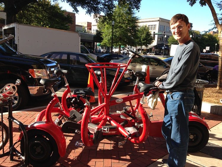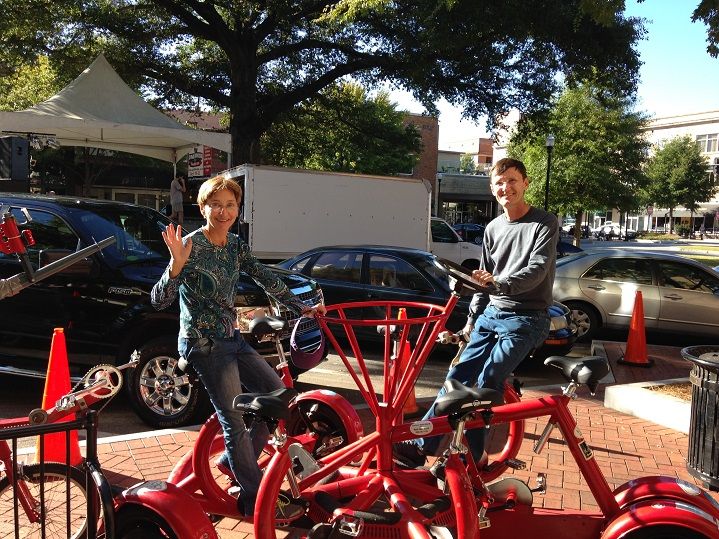 Идем дальше и натыкаемся на велосипедный магазн. На улице у них куча необычных велосипедов и среди них стоит интересный агрегат – многоместный велосипед. Велосипедисты на нем сидят по кругу, лицом вовнутрь и у каждого свои педали. Руль только у того, кто сидит лицом по ходу движения. Просимся посидеть и сделать нашу фотографию.
