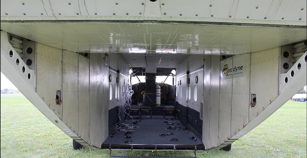 Вот на таком двухпоплавковом шасси (в версии гидросамолёта). Через широкий задний люк, при поднятой (внутрь фюзеляжа) его задней створке.