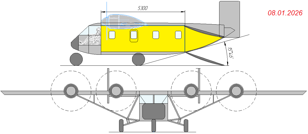Вот я вам выкладывал ещё 8-го числа компоновку 4-хмоторного "летающего сарая" с максимальной взлётной массой 4820 кг под двигатели РИТМ-7 😆 😎 по мотивам двухмоторного британского "Short Skyvan". Тут и безопасность завершения полёта при отказе одного движка повыше получится, и даже продолженный взлёт можно будет предположить, и характеристики УВП за счёт появления обдувки большой площади крыла с выдвижными закрылками Фаулера "автоматом" проявятся.. И коммерческая загрузка будет до 1500 кг на расстояния полёта до 500 км. Скорости большой правда не будет. Но не меньше, чем у того же АН-2 она будет точно 😆