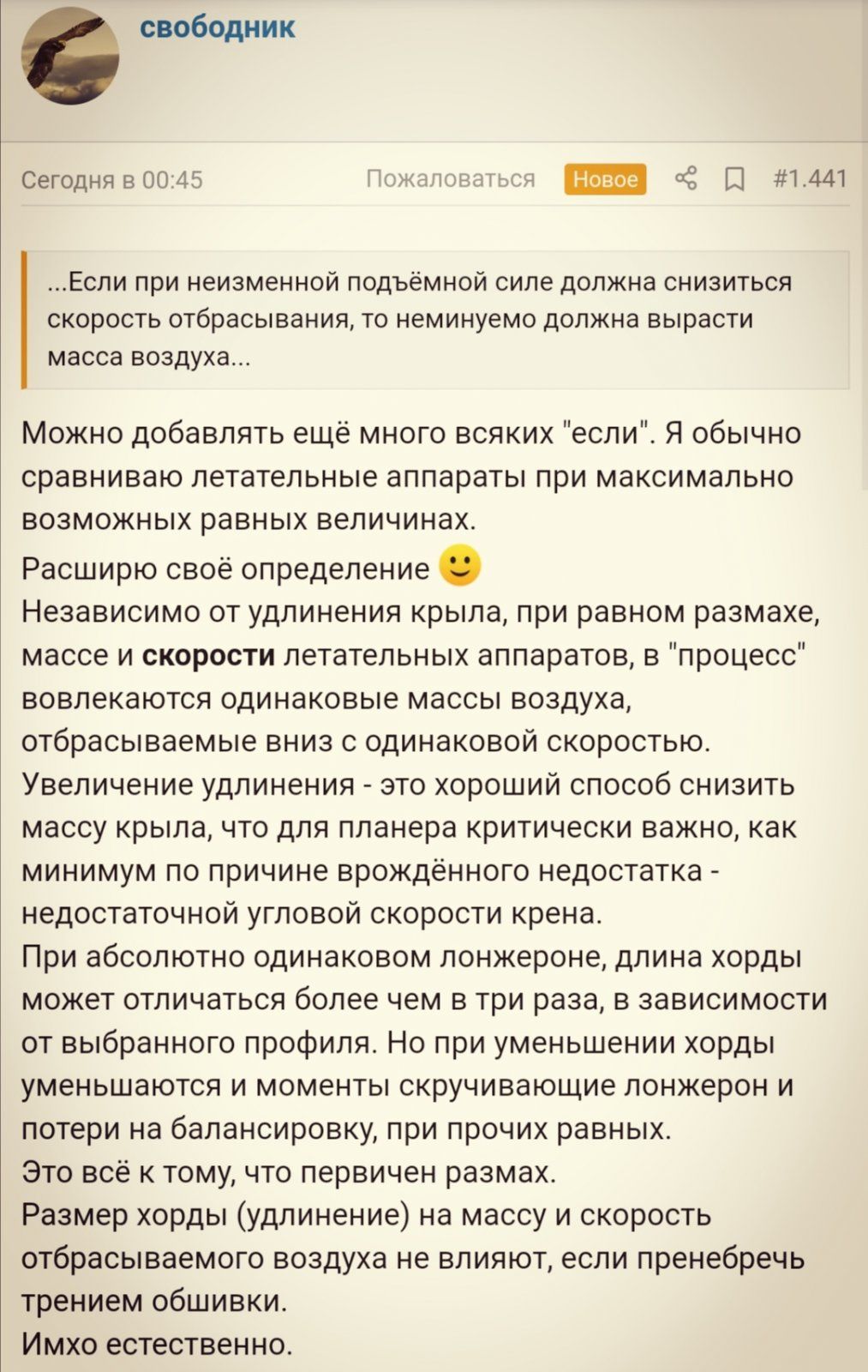 Можно добавлять ещё много всяких "если". Я обычно сравниваю летательные аппараты при максимально возможных равных величинах....Если при неизменной подъёмной силе должна снизиться скорость отбрасывания, то неминуемо должна вырасти масса воздуха...
