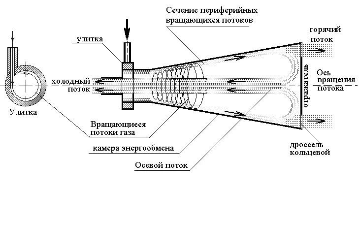 Вихревая труба. Труба Ранка-Хилша. Прикольный девайс. Применяется в холодильной технике и похожих областях, например для осушения пара,или для разделения газов, жидкостей. Кпд невелик, заьо движущихся деталей нет, может работать в невесомости потому применялся/применяется в КА и ЛА. Было пара книжек по данной теме. В инете есть. Еще интересна термоакустика, акустические трубы, особенно изза некотороц схожести процессов с ПуВРД и нашими думками про волновое сжатие.