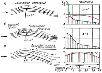 Неупорядоченная вихревая зона рассеивает пик разрежения по всей ширине крыла, - поэтому эта зона имеет низкий горбик коэффициента распределения давления Ср.
