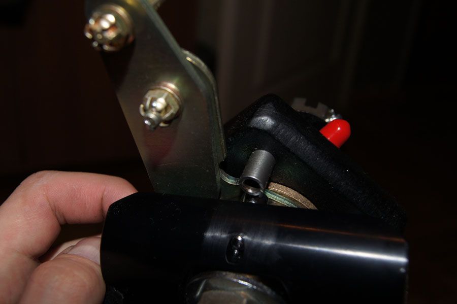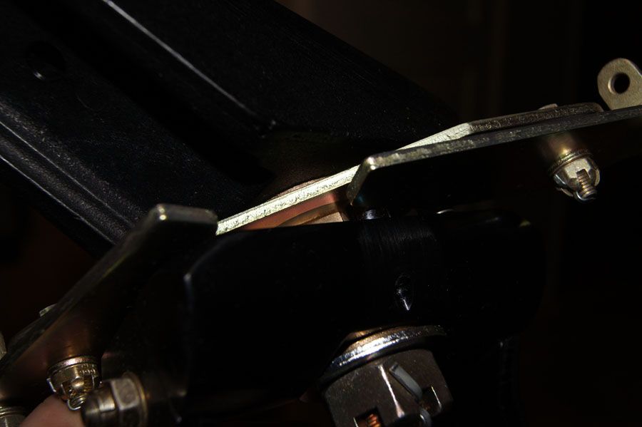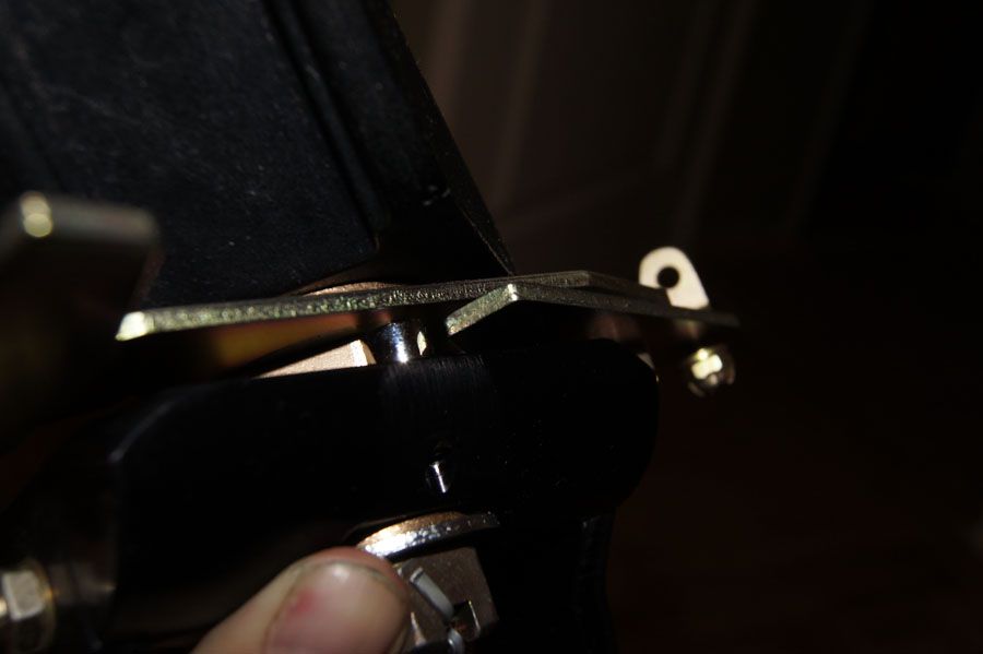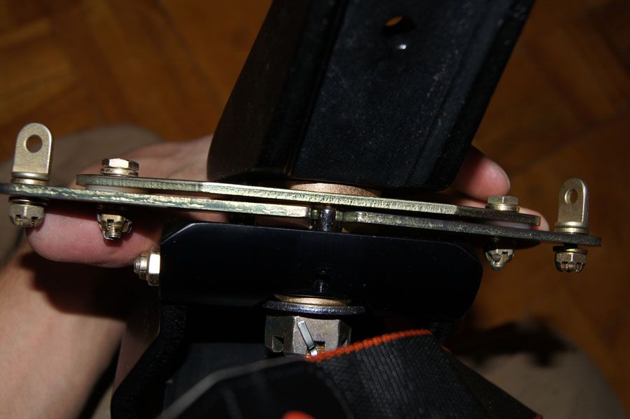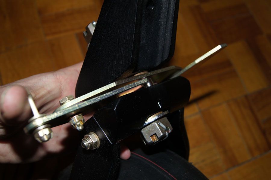 На фото видно как устроен принцип работы механизма. При повороте опоры на 45 градусов задний штифт выталкивает лепесток через проточку в качалке. Лепесток к которому прицеплен руль направления изначально уперт в передний штифт. После выталкивания он перепрыгивает штифт и опора свободно проворачивается. По фото это хорошо видно.