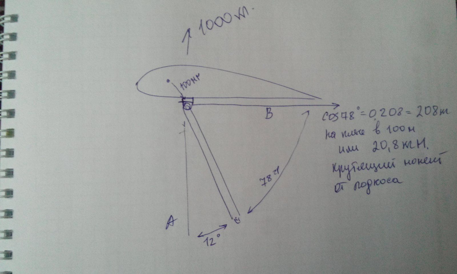 Вопрос: Однолонжеронное крыло с лобовой частью работающей на кручение. На подкосе 1000 кг на растяжение(вектор А). Сам подкос под углом, что дает продольную силу в 208 кг(вдоль вектора В) на плече в 100 мм между цж лобика и стыковочным болтом подкоса, или 20,8 кгМ кручения в том же направления, что и основная аэродинамическая сила-то есть на пикирование. Нужно ли приплюсовать к крутящему моменту эти 20.8 кгм при расчете толщины обшивки лобика на участке между подкосом и корневыми узлами крепления ?