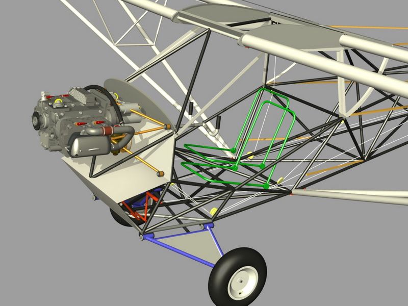 Обшит фюзеляж тканью как и крыло, только лобик алюминиевый. конструкции крыла рассматривал две. Двухлонжеронное деревянное и из дюралевых труб. Кабина зашита листами, а капот пластиковый. Мотор от 40 л.с.