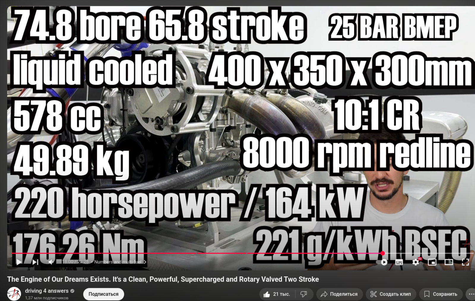 Двухтактный ДВС с сухим картером, раздельной смазкой, приводным нагнетателем и вращающимся клапаном на выпуске.