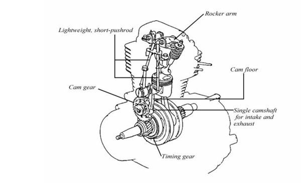 Толкатель стоит прямо к кулачку, штанга под углом на сферическом подпятнике. Так делается на большинстве оппозитов унаследовавших ЦПГ со "звёзд". Были и обратные истории, параллельные штанги от оппозитов, установленные на звёздах.