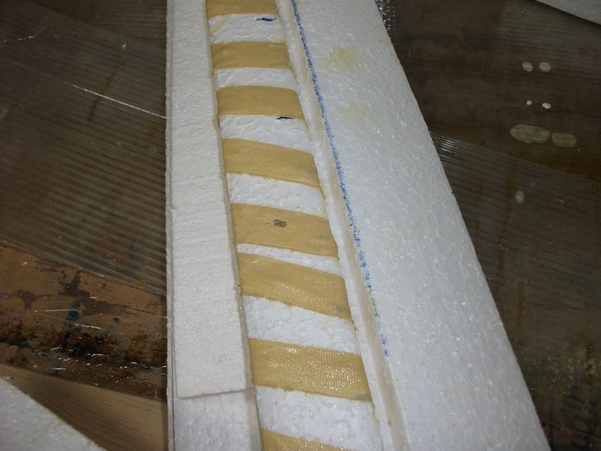 Если не боитесь дерева , можете еще взять полосу фанеры (6-8 мм) вырезать под углом +/-45 и вклеить в разрыв пенопластового вкладыша и у вас будет отличный лонжерон с поясами из стекла и стенкой из фанеры... фанеру можно стыковать по длине просто встык, без усов, и облегчать по расчету и желанию.🙂))