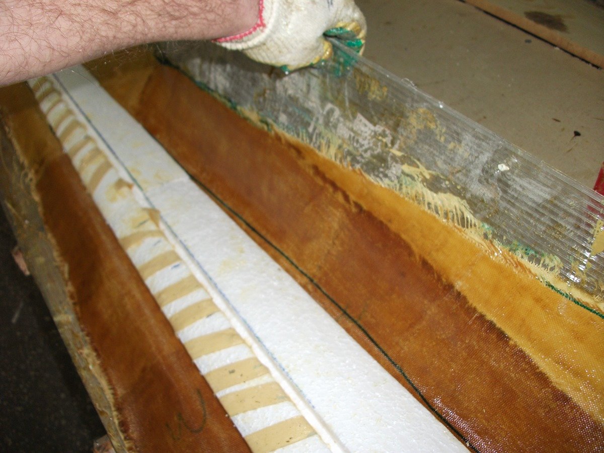 Сдвиг по линиям передней и задней кромок у меня обеспечены полноценными цельными нитями стеклоткани , а не как у большинства винтоделательной технологии -склеенные именно по этим линиям . ЭТО САМОЕ критичное ЧТО заставляет изготовителй чрезмерно утолщать , разнообразные способы склейки применять ( и в замок и накладками и избытком смолы с жгутом ......) А уж про качество выбранного клея при этом ,соблюдение технологии опять же требует излишниго материала ( веса ) для запаса прочности ........... ЭТОТ избыток порой ( при вскрытии и препарировании ) я обнаруживал в количестве до четверти веса ...