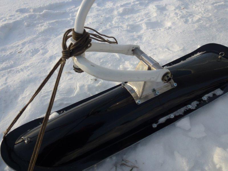 Фото лыжи делалось в момент монтажа. Угол в конструкции задается резиновым амортизатором и страхуется тросом/стропой, куда привязать есть, необходимые узлы есть в любом учебнике. Многолетний опыт эксплуатации лыж подобной конструкции на дельталетах показывает что платиковая лыжа дешевле и надежней, без последствий переживает наезды на камни и т.д.Я не вижу предохранительного троса