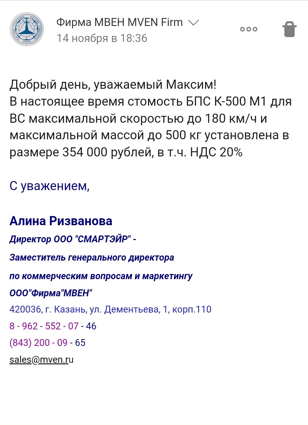 Хочется отметить четкую работу МВЭН. Отправлял в этом месяце спассистему на обслуживание, тк в следующем году ей 12 лет, срок очередного профукал еще в 21 году, вот и решил напоследок. Позвонил, все вежливо разъяснили,отправил, буквально за несколько дней все сделали и отправили обратно за 12000 р. Уже получил и обратно прикрутил. Дай бог Вам оставаться на отечественном рынке долго,долго! Кстати, пока с/с ездила из архангельской области в Казань, летал без нее, над лесами и болотами как обычно у нас. И вот отметил, ну ни так на душе уже было летать, ой ни так.