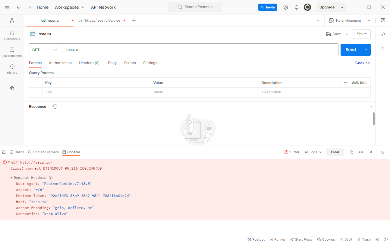 Сам скрипт тоже не загружается (как и кешируемый ответ ошибки) и если запускать браузер в режиме инкогнито, то будет уже не красивая ошибка сервиса, а системный TIMEOUT.
