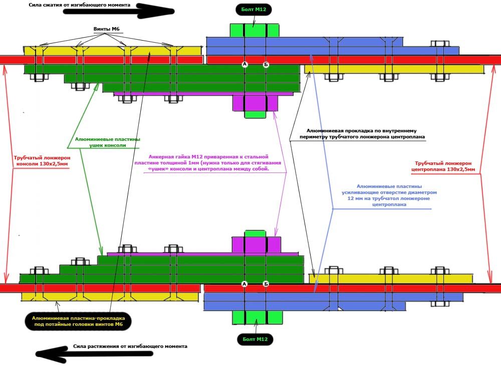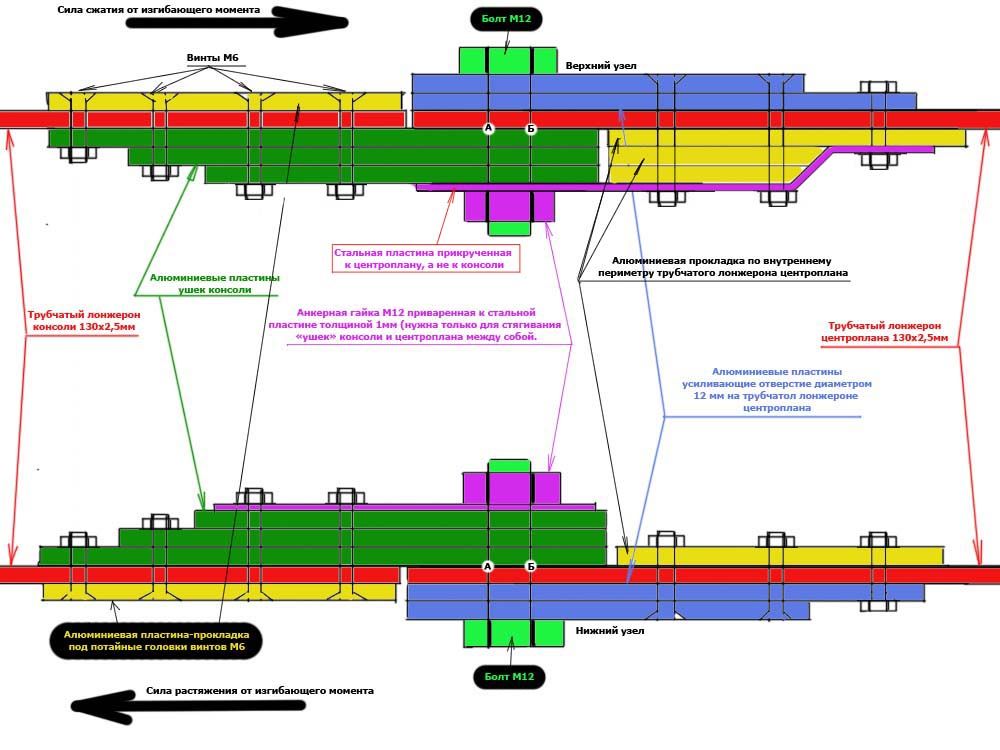 Исправляю крепления консолей к центроплану. Отверстия диаметром 12мм в верхней и нижней внутренних алюминиевых пластинах "ушек" рассверлил до диаметра 14мм, вставил в эти отверстия стальную трубочку-распорку диаметром 14х1мм. Пакет "ушек" из оставшихся 4-х пластин стяну пистоном 14х1мм из нержавеющей стали (пока не нашел подходящую трубочку).Вот это решение категорически не поддерживаю. Ладно бы, пластина была бы на поверхности среза - так она с другой стороны.Единый болт был бы однозначно лучше, а в уши надо вбить по втулке. Между ушами можно вставить профиль, и убрать аргумент у считающих невозможным взятие перерезывающей силы.