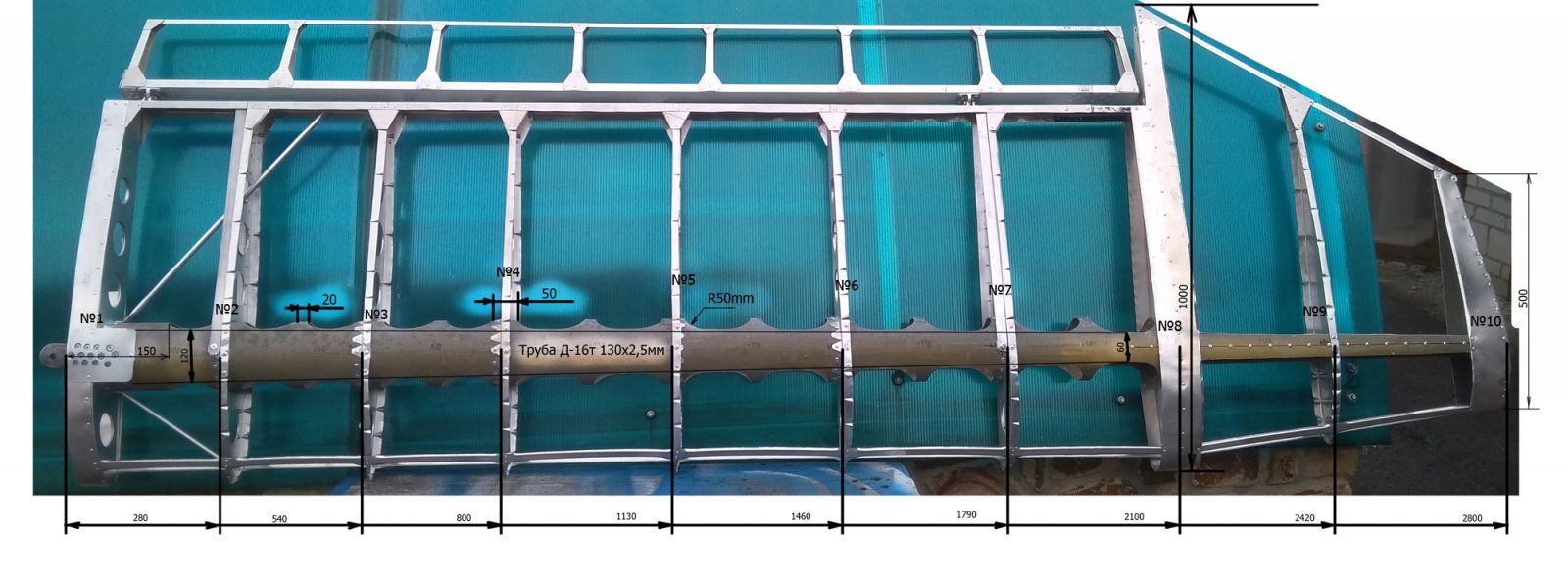 - участок №2 (от нервюры №4 до нервюры №8). В какой-то мере за счет боковых перемычек трубчатого лонжерона.
