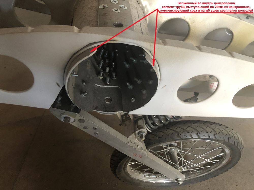 Для компенсации среза и изгиба ушек крепления консолей, во внутрь трубчатого лонжерона центроплана 130х2,5мм, вложен и прикручен болтами уменьшенный до диаметра 125х2,5мм обрезок такой же трубы длиной 200мм. Этот обрезок трубы выдвинут на 20мм, и входит во внутрь трубчатого лонжерона консоли крыла.Третье - сами "ушки" работают на изгиб и срез и при этом имееют не самую лучшую для этих целей геомеритрическую форму.