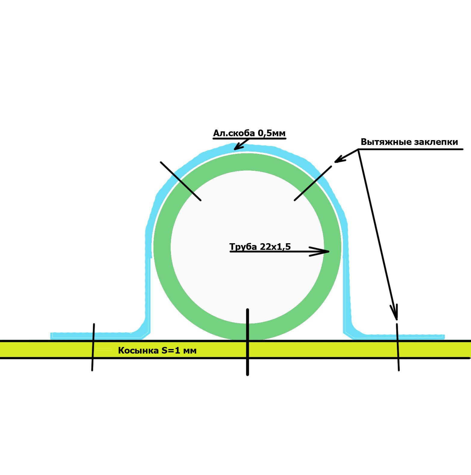 Т.к. использую обычные вытяжные заклепки со строительного рынка (алюминиевые со стальным стержнем), а их прочность колеблется в зависимости от производителя, устанавливаю в основном по 3 заклепки. Косынки увеличил не только из-за устойчивость труб из АД31, но так же из за того, что трубы раскосов приклепаны к косынкам только с одной стороны, и надо с обратной стороны зафиксировать трубы от проворота алюминиевыми скобами как на схеме.