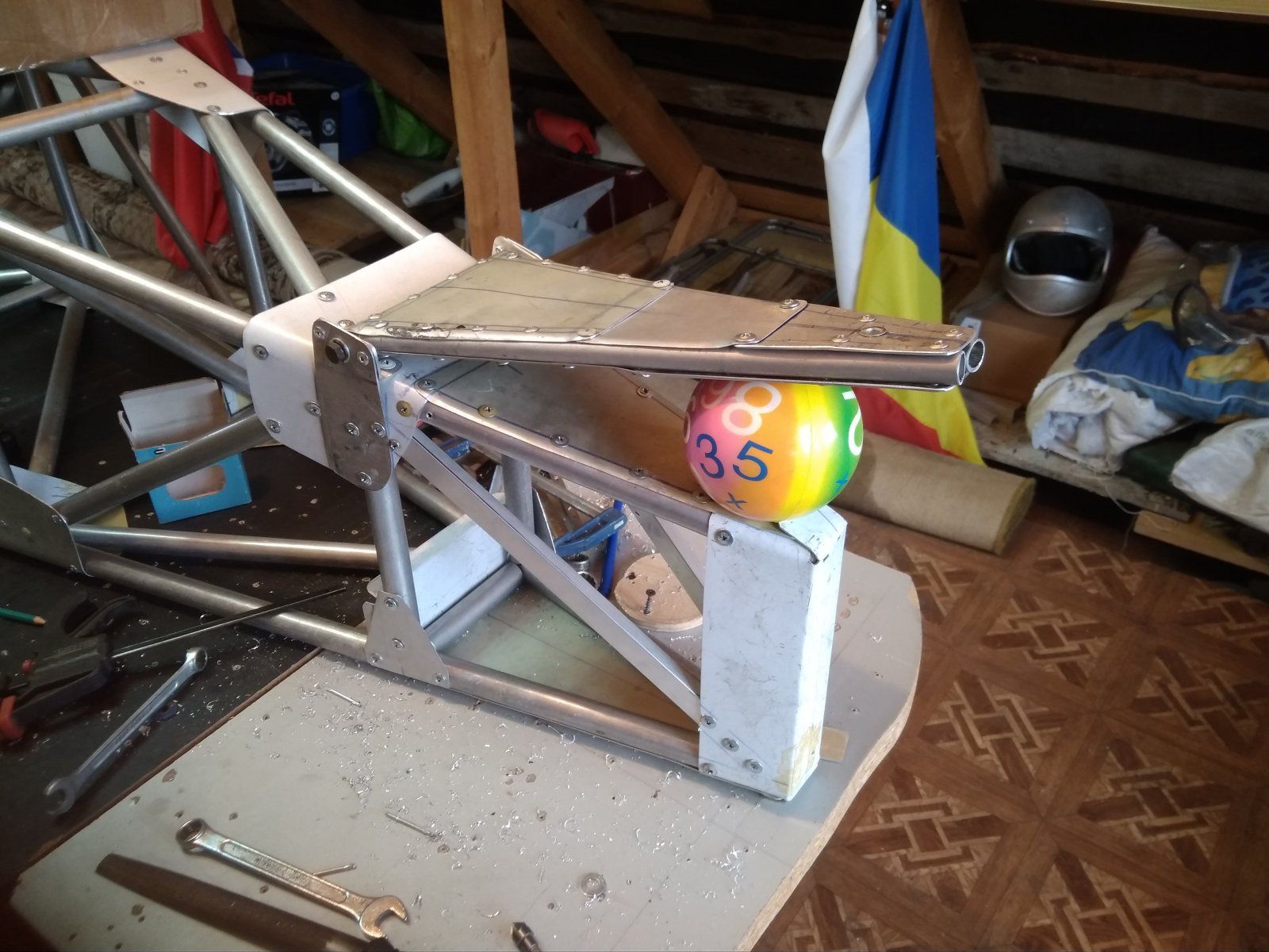 Клепаю хвостовую опору. Вместо амортизатора думаю установить детский мяч для баскетбола TARMAK, его диаметр примерно 130мм, вес 167 грамм.