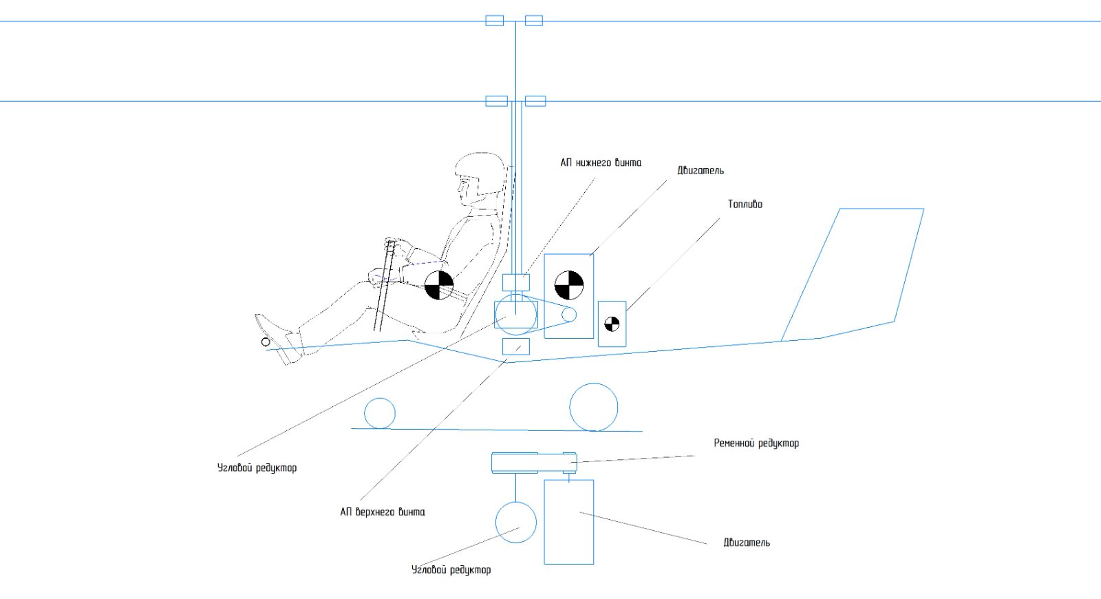 Такой вариант компоновки прорабатывался мной. Здесь есть несколько нюансов: 1. Положение ЦТ пилота относительно точки S - вовсе не такое оптимистичное как нарисовано на схеме. Если быть ближе к реалиям, то положение достаточно сильно сместится вперед и понадобится оттаскивать двигатель назад. 2 у двигателя на данной схеме не учтены выступающие элементы и агрегаты (карбы, впускные устройства или наоборот выпуск ) которые не позволят вплотную прижать двигатель к редуктору. 3. Очень длинные валы, потребуют промежуточных опор, которые в свою очередь потянут за собой конструктив в виде фермы или пилона, а следовательно вынудят еще больше сместить пилота, а он потянет за собой смещение других агрегатов.Я бы делал так.