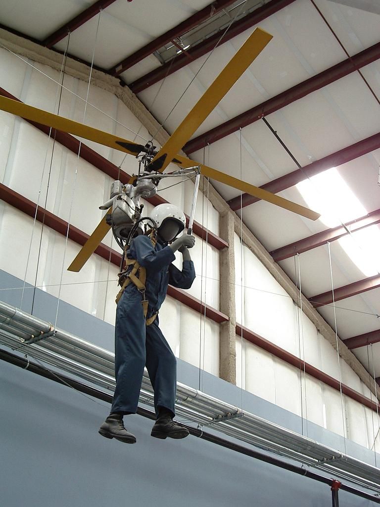 Вертолёт весит значительно больше чем пилот . Получается , что большая часть энергии затрачивается на перемещение железа , а не пилота .   Летает аппаратик очень шустро .