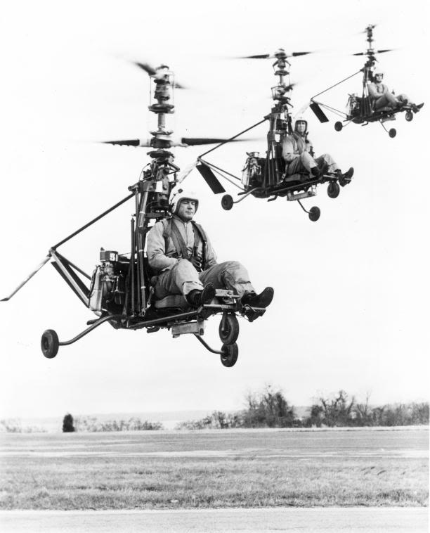 В 1940-х и начале 1950-х годов, ряд новых конструкций для Страпон вертолеты появились. Если солдаты могли подняться в воздух только с оборудованием на спине, тогда они могли действовать независимо от громоздкой инфраструктуры, необходимой для поддержки обычных самолетов и будет иметь беспрецедентную свободу передвижения на короткие расстояния. Несколько инженеров пытались применять вновь разработанные вертолет технологии идее, с надеждой, что такие продукты также коммерческих или спортивных приложений. Гораций Пятидесятница была одним из более успешных пионеров в этой области, но, в конечном счете, эти фантастические конструкции не хватает утилиты для гарантии безопасности риски, связанные с полетами такие элементарные самолетов.