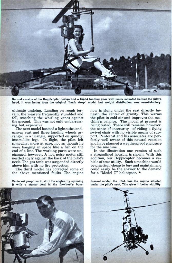 В 1949, это Hoppi-Copter дизайн эволюционировал через 102, 103, и 104 вариации. Этот последний дизайн летел хорошо, но, как и в более ранних моделях, пилоты обнаружили, элементы управления очень чувствительные. Также, как и другие ультра-легкий вертолет проектов, дезориентация была существенная проблема на значительных высотах над землей. Hoppi-Copter пилотов не было никаких самолетов структуры для приведения в соответствие с горизонта, чтобы обеспечить адекватный визуальный справочник для управления самолетом, и вибрации и постоянного движения воздушных судов, оказываемых свои кинестетические чувства бесполезно.