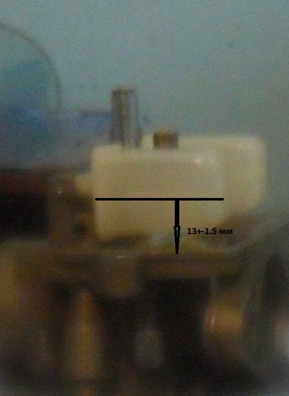 Вот так: при перевернутом положении расстояние от фланца до средней линии поплавка должно быть 13+-1.5 мм. Я выставил ровно 13 мм, подгибанием медной пластины (язычка), в который вставляется ножка запорной иглы.