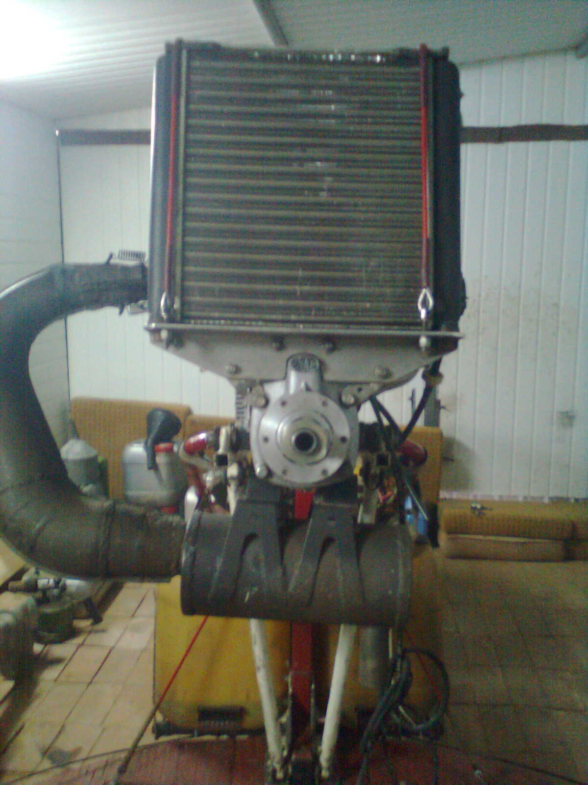 Головки тех же водных Ротаксов цельные на оба цилиндра. В воздушниках они свинчены между собой через кожух охлаждения. ИМХО это делает мотор жестче на изгиб и кручение, повышая резонансные частоты. Особенно, когда он закреплен картером всеми 4 точками на целой плите.  Здесь плохо видно, не очень все понятно, однако есть подозрение, что это исполнение мотора будет достаточно гибким в работе. И на сколько я помню, коленвал не обрезался? Может получиться очень хороший вибратор.  :-/