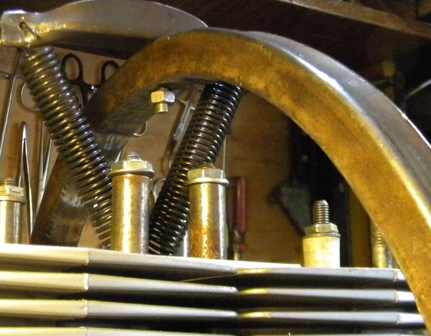 Верхние более слабые пружины подобраны таким образом, чтобы собственная частота колебаний в продольной вертикальной плоскости была такая же как и в  горизонтальной плоскости  на нижних пружинах.