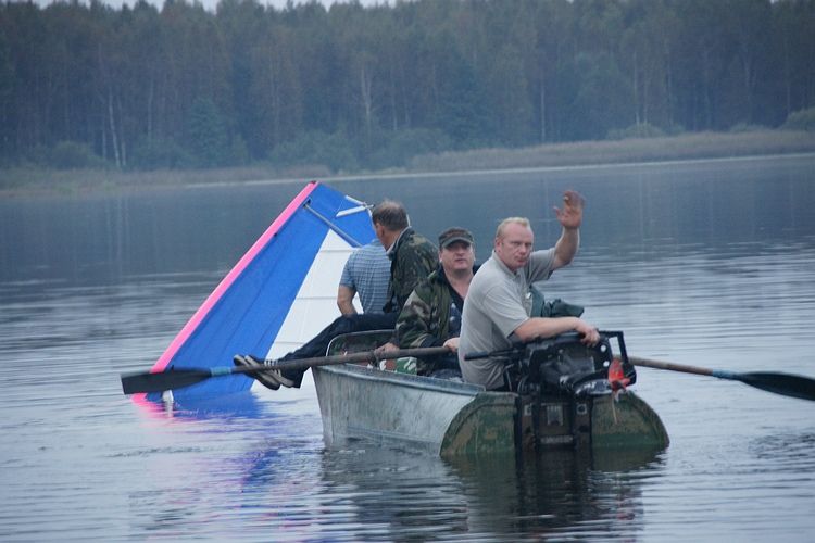 При подходе ближе понял что из воды торчит крыло дельталета. И вдобавок я узнаю что один из моих пассажиров врач. При первом заходе, как я не старался, получился хоть и мягкий но отход от воды. По ощущениям и опыту не больше метра, что на моем корабле простительно, но точно определить не смог, и снизу и сверху все серое. Ушел на второй круг, зашел от самого берега и после трех косаний наконец сел. Процедуру посадки здорово усложняло наличие четырех человек на борту и практически максимальный взлетный вес. Экипаж был зарание предупрежден что при наличии пострадавших кому то придется продолжить прогулку на моторной лодке, с Тростянского выбратся с травмами очень сложно.