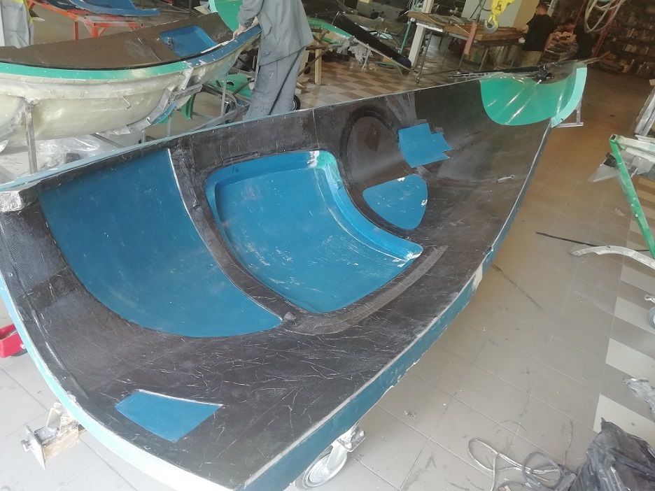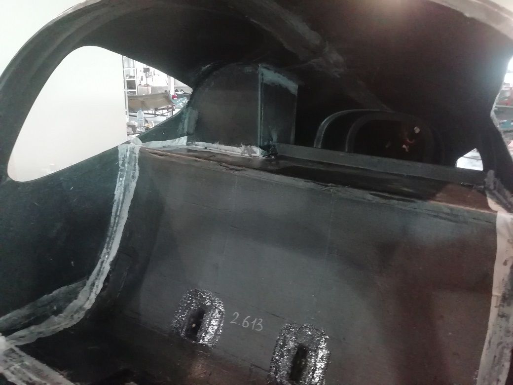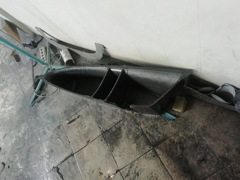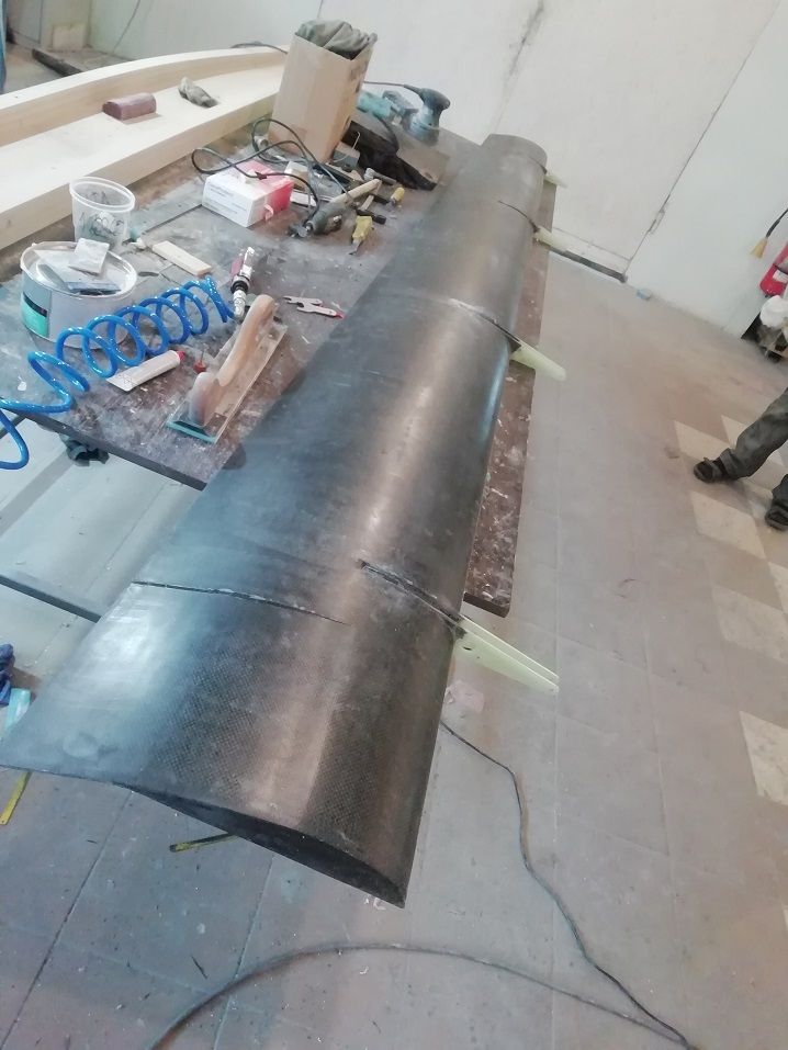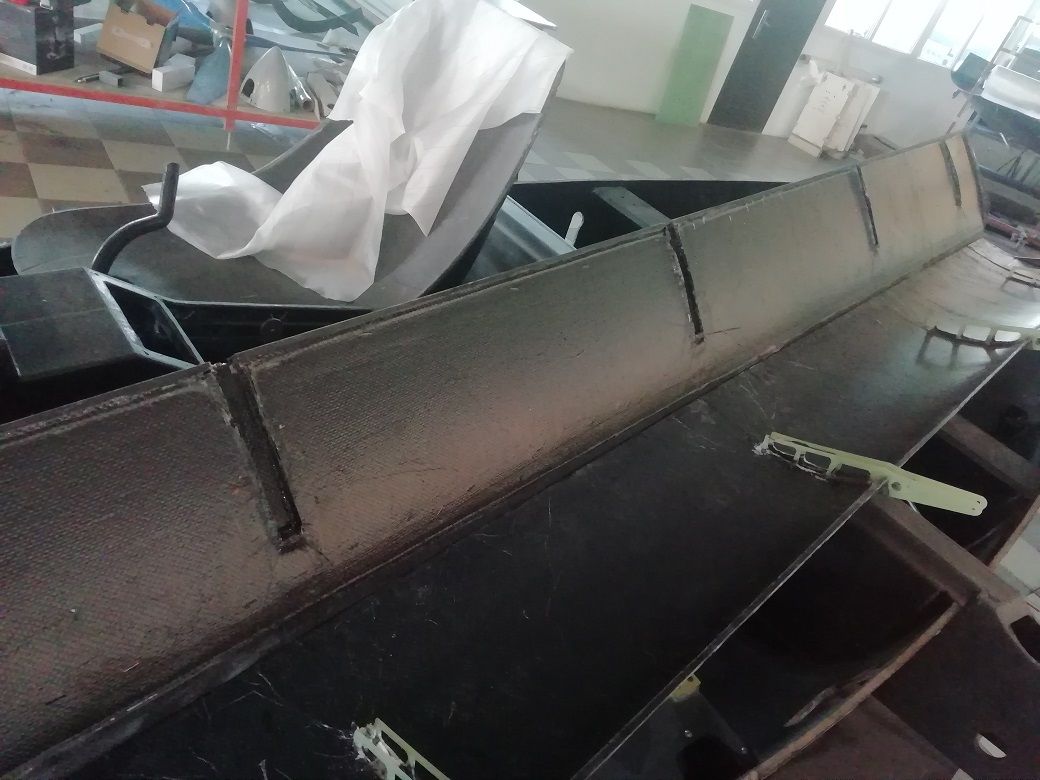 Тем временем проклеиваем швы между обшивками. Снаружи клеем один слой угля 200г\м2 и с верху стекло 163, из рсчета, что оно счухается при шпаклевке. Внутри один слой угля.