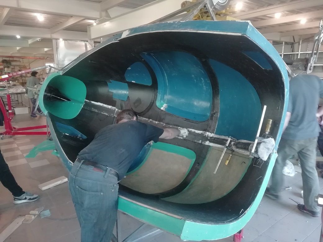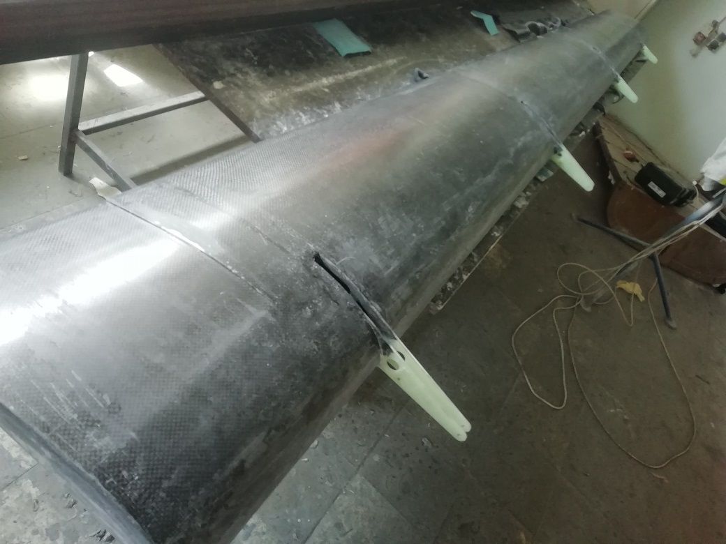 Пока технологически, Вы не можете выполнять фюзеляж целиком (боковину, без присоединения хвостовой части). Вы не считали, насколько можно будет снизить вес, если выполнять эту деталь (в дальнейшем) целиком и имеет ли это смысл? сейчас Вы соединяете части фюзеляжа используя два слоя ткани снаружи и два слоя внутри? или слоев больше. ширина ленты какая? расположение лент по ширине, сначала узкую, потом перекрываете широкой или сначала широкая, потом идет узкая?