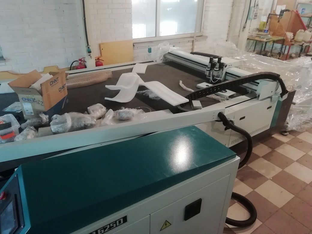 Так же получили новый режущий плотер для резки пенопласта и ткани с несколькими ножами, маркером и размотчиком рулонов